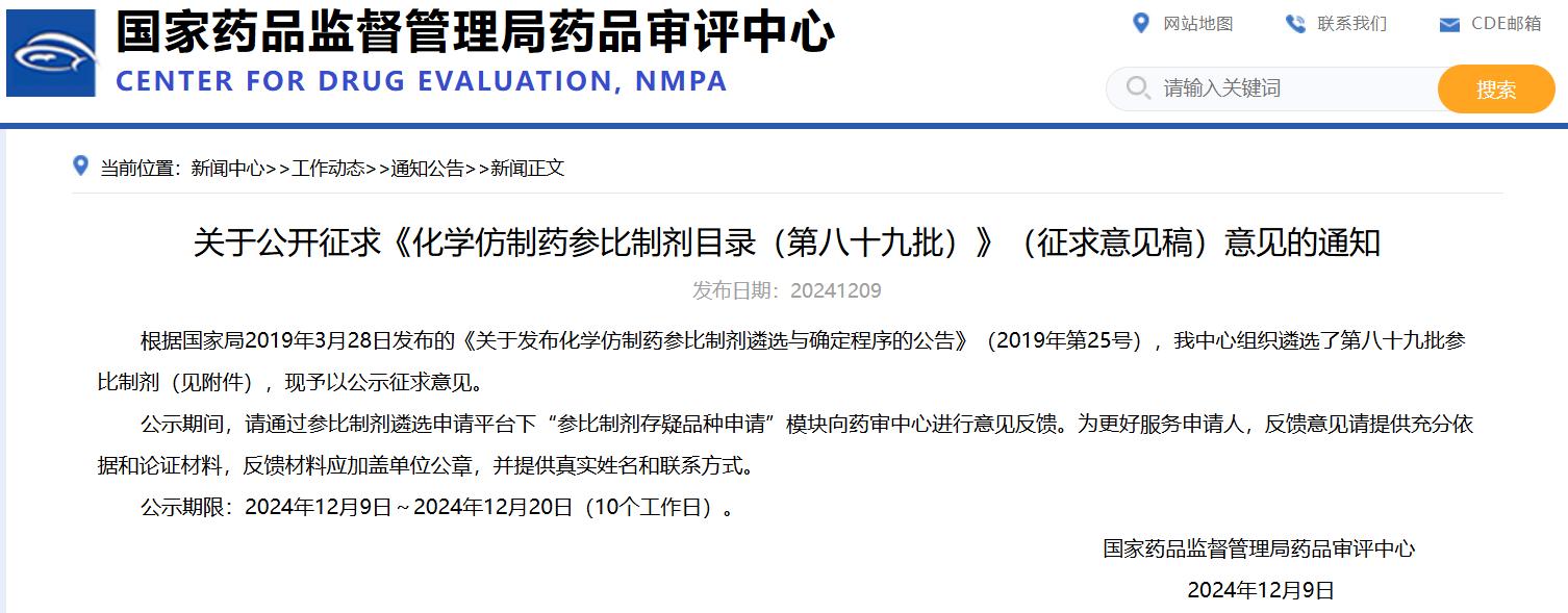 關于公開征求《化學仿制藥參比制劑目錄(第八十九批)》(征求意見稿)意見的通知