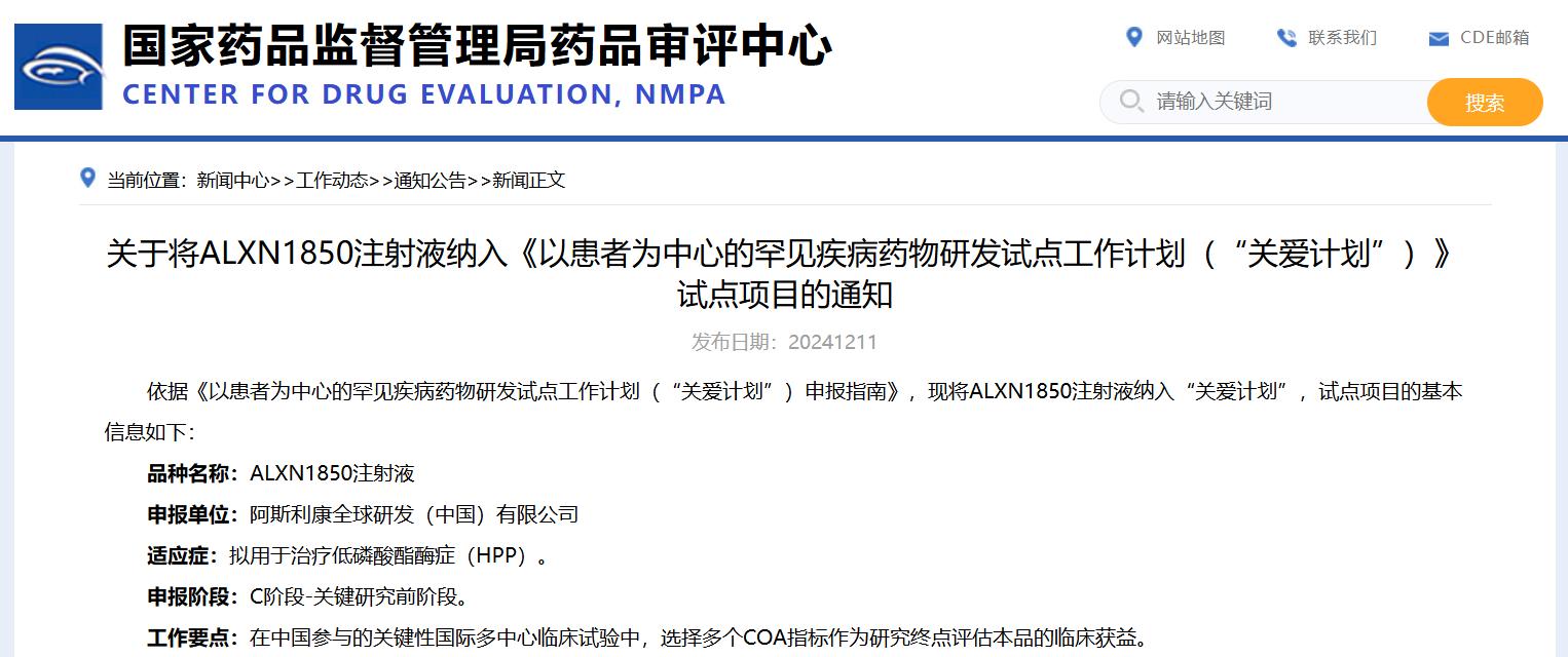 關于將ALXN1850注射液納入《以患者為中心的罕見疾病藥物研發(fā)試點工作計劃(“關愛計劃”)》試點項目的通知