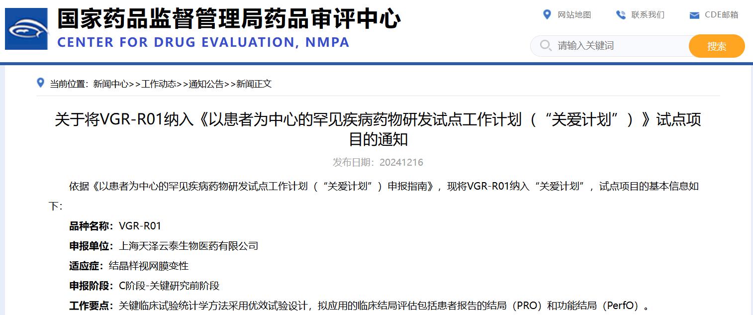 關(guān)于將VGR-R01納入《以患者為中心的罕見疾病藥物研發(fā)試點(diǎn)工作計(jì)劃(“關(guān)愛計(jì)劃”)》試點(diǎn)項(xiàng)目的通知