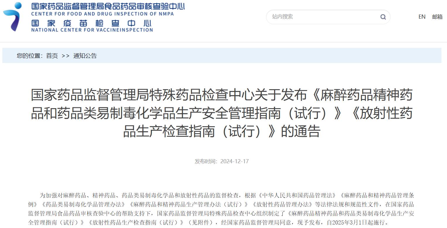 國家藥品監(jiān)督管理局特殊藥品檢查中心關(guān)于發(fā)布《麻醉藥品精神藥品和藥品類易制毒化學(xué)品生產(chǎn)安全管理指南(試行)》《放射性藥品生產(chǎn)檢查指南(試行)》的通告