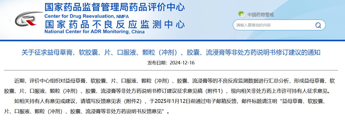 關(guān)于征求益母草膏、軟膠囊、片、口服液、顆粒(沖劑)、膠囊、流浸膏等非處方藥說明書修訂建議的通知