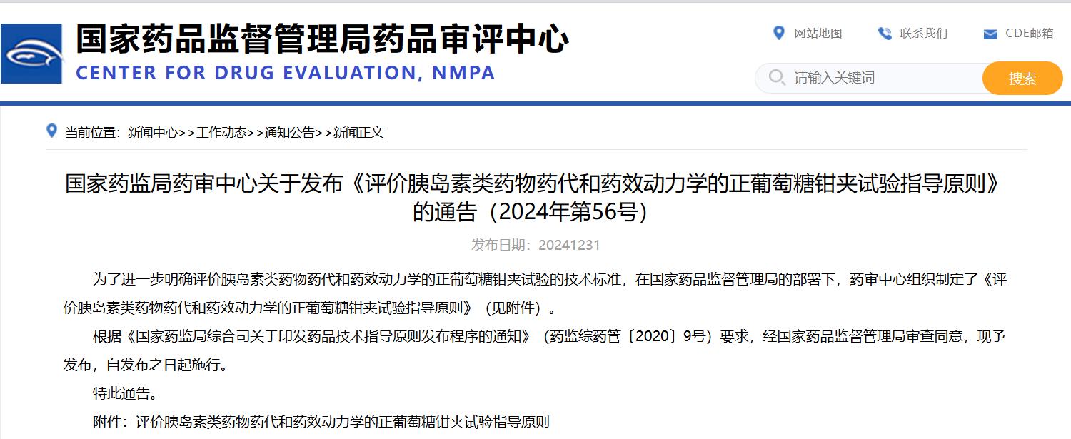 國家藥監(jiān)局藥審中心關(guān)于發(fā)布《評價胰島素類藥物藥代和藥效動力學(xué)的正葡萄糖鉗夾試驗(yàn)指導(dǎo)原則》的通告(2024年第56號)