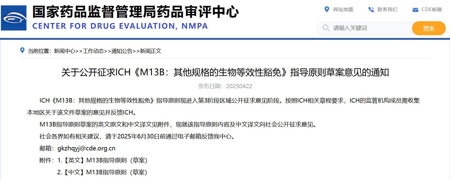 關(guān)于公開征求ICH《M13B:其他規(guī)格的生物等效性豁免》指導(dǎo)原則草案意見的通知