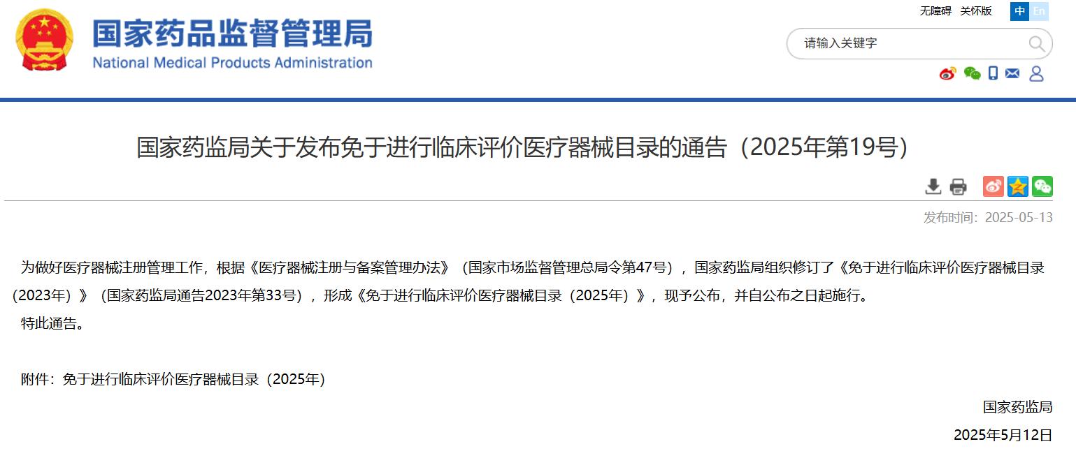 國家藥監(jiān)局關(guān)于發(fā)布免于進(jìn)行臨床評價醫(yī)療器械目錄的通告(2025年第19號)