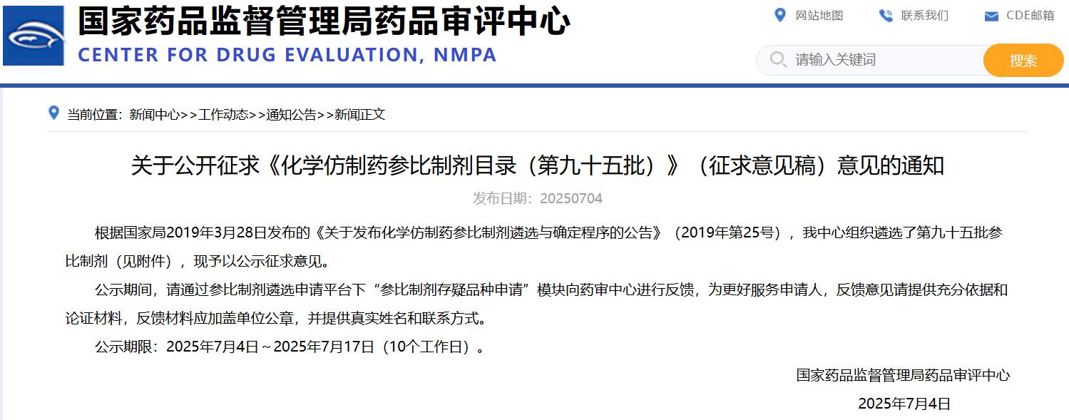 關(guān)于公開征求《化學(xué)仿制藥參比制劑目錄(第九十五批)》(征求意見稿)意見的通知