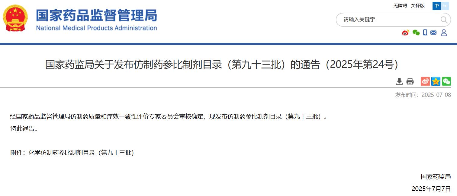 國家藥監(jiān)局關(guān)于發(fā)布仿制藥參比制劑目錄(第九十三批)的通告(2025年第24號)