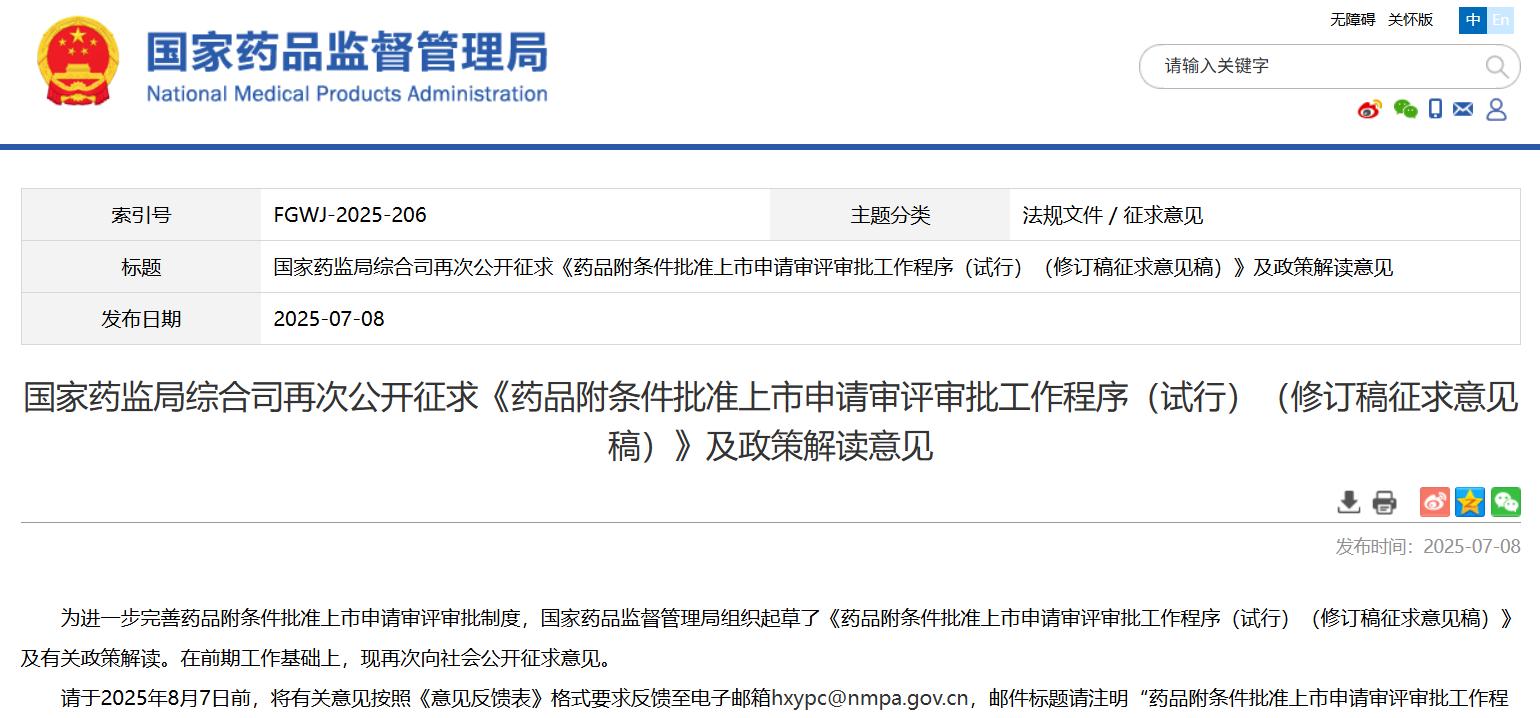 國家藥監(jiān)局綜合司再次公開征求《藥品附條件批準(zhǔn)上市申請審評審批工作程序(試行)(修訂稿征求意見稿)》及政策解讀意見