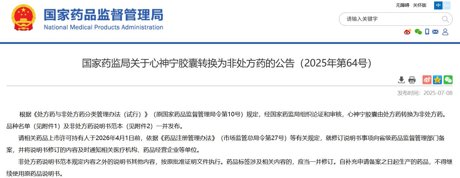 國家藥監(jiān)局關(guān)于心神寧膠囊轉(zhuǎn)換為非處方藥的公告(2025年第64號)