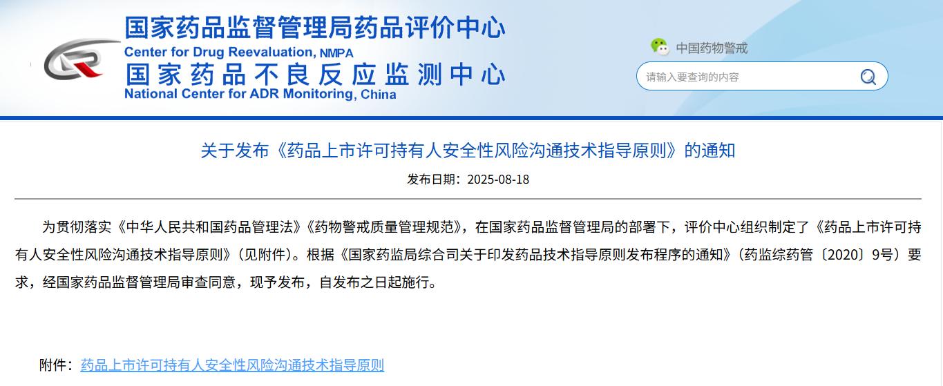 關(guān)于發(fā)布《藥品上市許可持有人安全性風險溝通技術(shù)指導原則》的通知