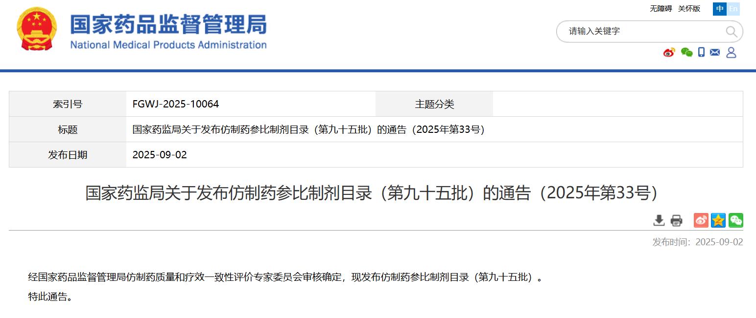 國(guó)家藥監(jiān)局關(guān)于發(fā)布仿制藥參比制劑目錄(第九十五批)的通告(2025年第33號(hào))