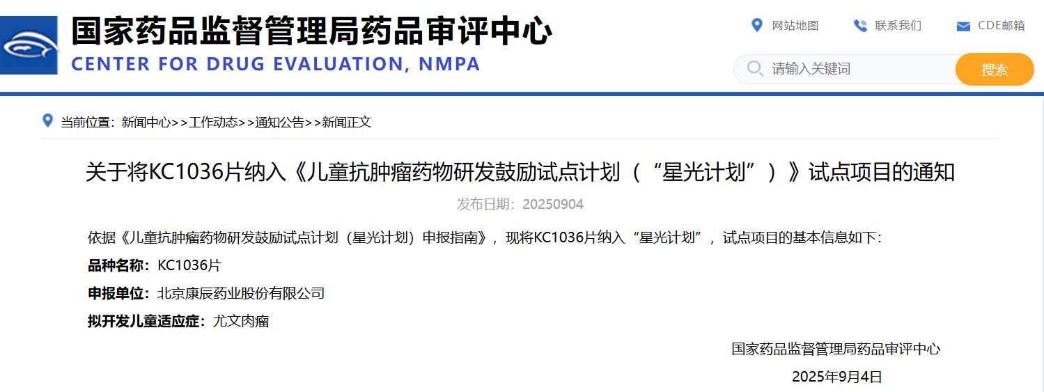 關(guān)于將KC1036片納入《兒童抗腫瘤藥物研發(fā)鼓勵(lì)試點(diǎn)計(jì)劃(“星光計(jì)劃”)》試點(diǎn)項(xiàng)目的通知