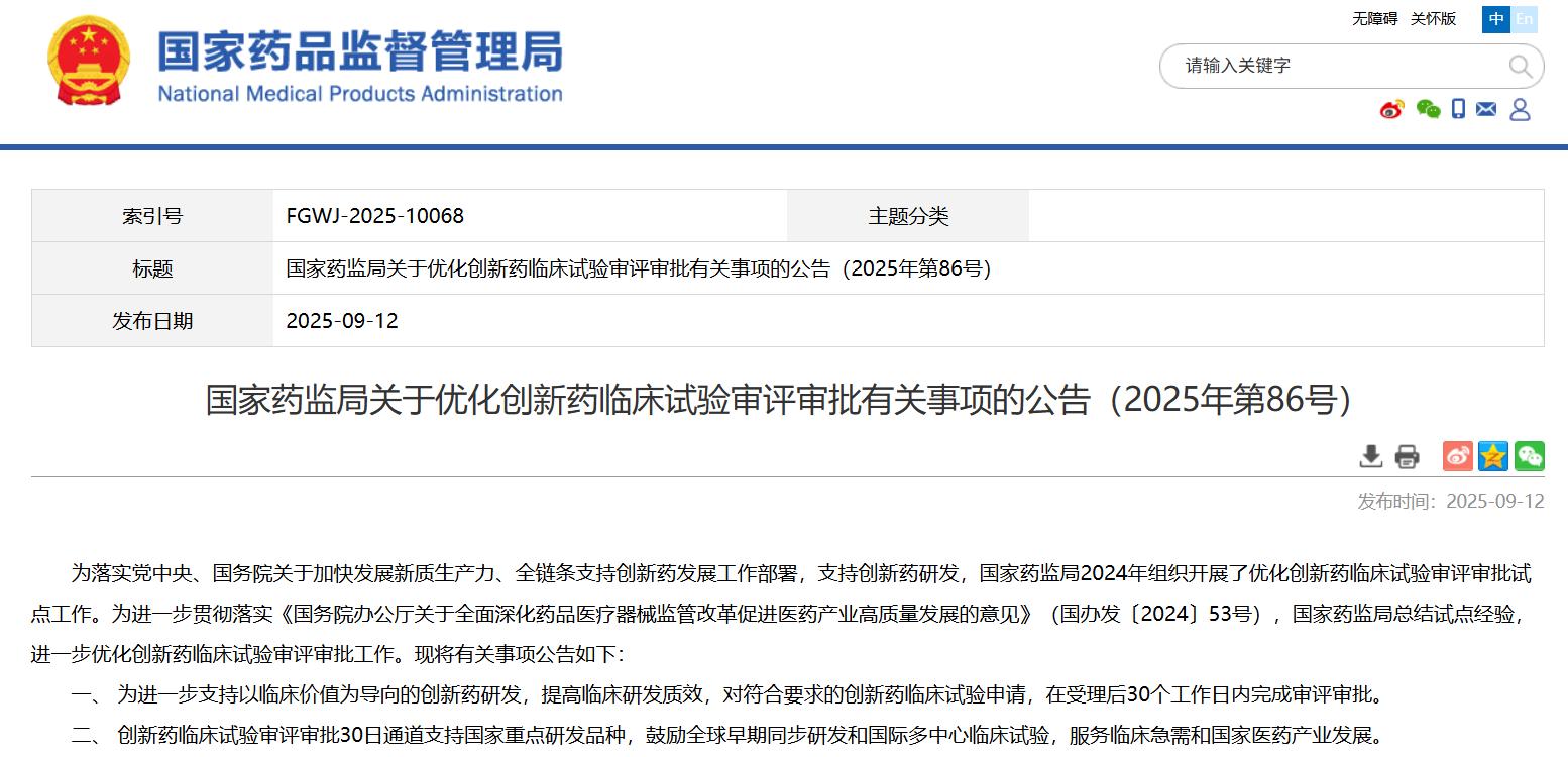 國家藥監(jiān)局關于優(yōu)化創(chuàng)新藥臨床試驗審評審批有關事項的公告(2025年第86號)