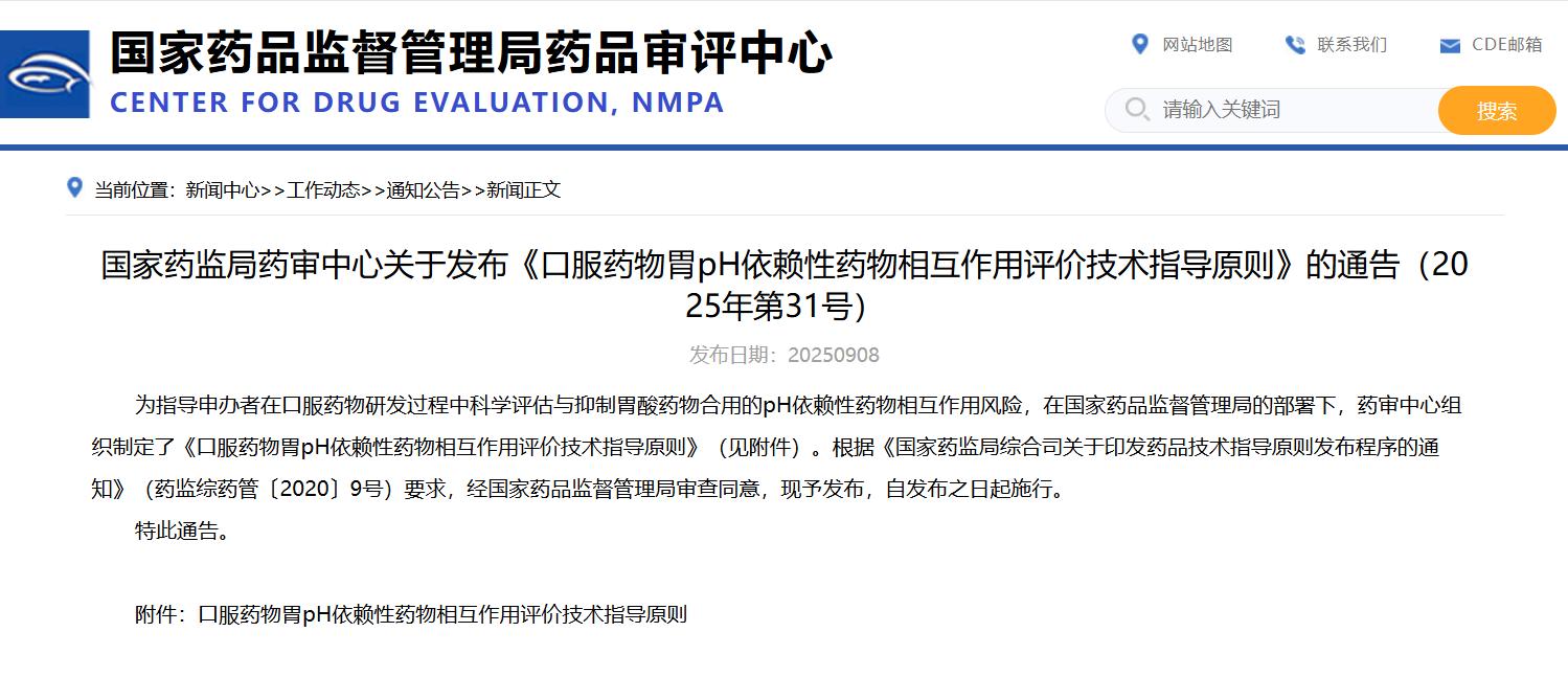 國家藥監(jiān)局藥審中心關于發(fā)布《口服藥物胃pH依賴性藥物相互作用評價技術指導原則》的通告(2025年第31號)