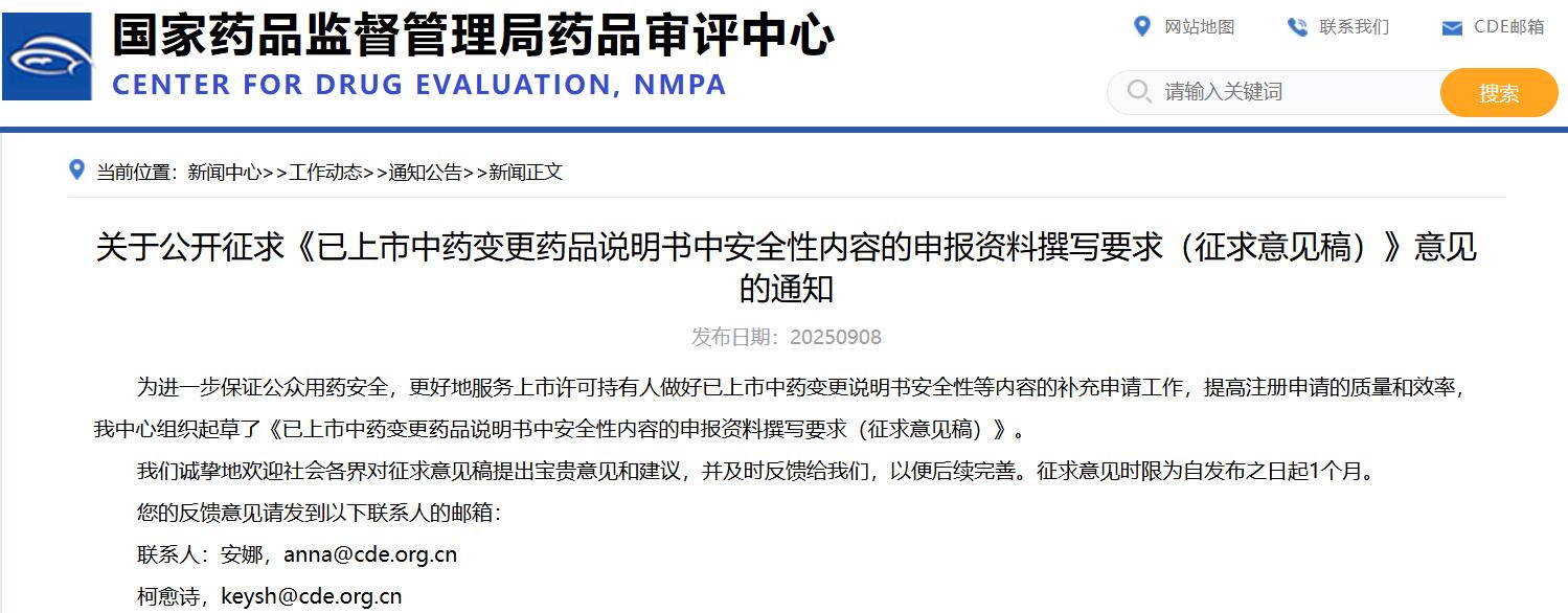 關于公開征求《已上市中藥變更藥品說明書中安全性內(nèi)容的申報資料撰寫要求(征求意見稿)》意見的通知