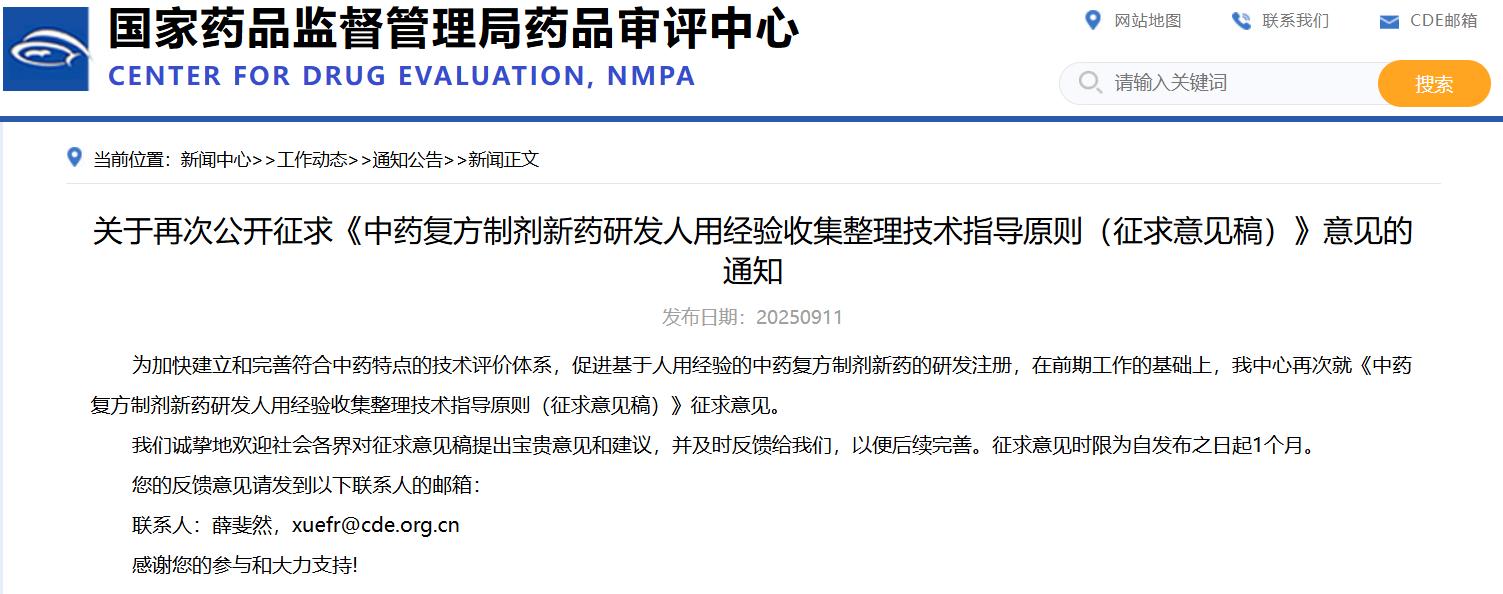 關于再次公開征求《中藥復方制劑新藥研發(fā)人用經(jīng)驗收集整理技術指導原則(征求意見稿)》意見的通知