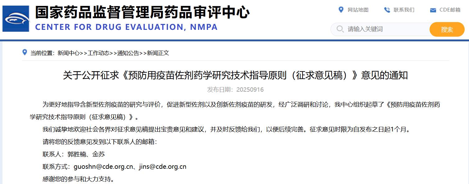 關(guān)于公開征求《預(yù)防用疫苗佐劑藥學(xué)研究技術(shù)指導(dǎo)原則(征求意見稿)》意見的通知