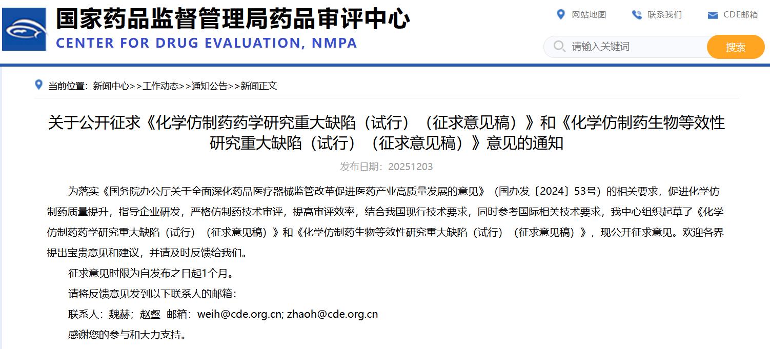 關(guān)于公開征求《化學仿制藥藥學研究重大缺陷(試行)(征求意見稿)》和《化學仿制藥生物等效性研究重大缺陷(試行)(征求意見稿)》意見的通知