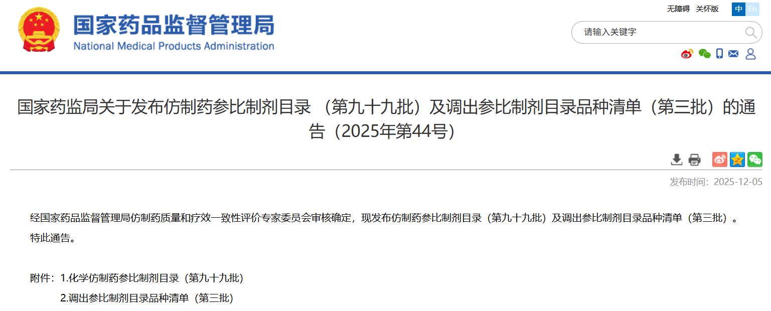 國家藥監(jiān)局關(guān)于發(fā)布仿制藥參比制劑目錄 (第九十九批)及調(diào)出參比制劑目錄品種清單(第三批)的通告(2025年第44號)