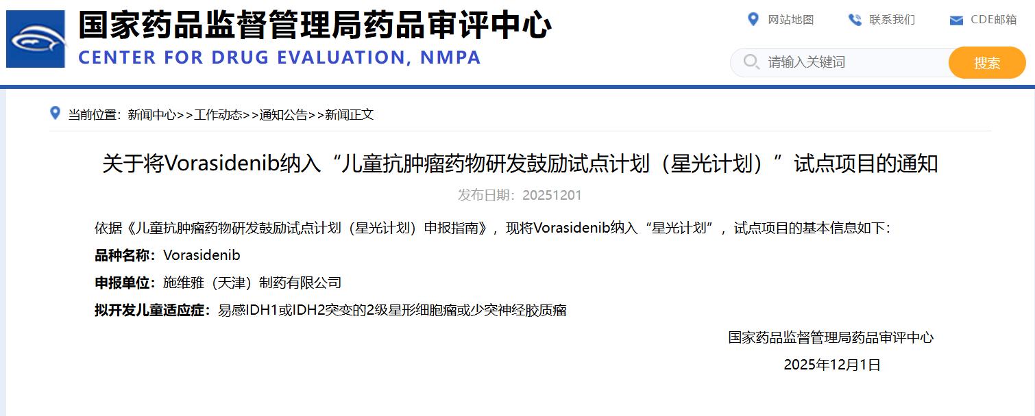關(guān)于將Vorasidenib納入“兒童抗腫瘤藥物研發(fā)鼓勵試點計劃(星光計劃)”試點項目的通知