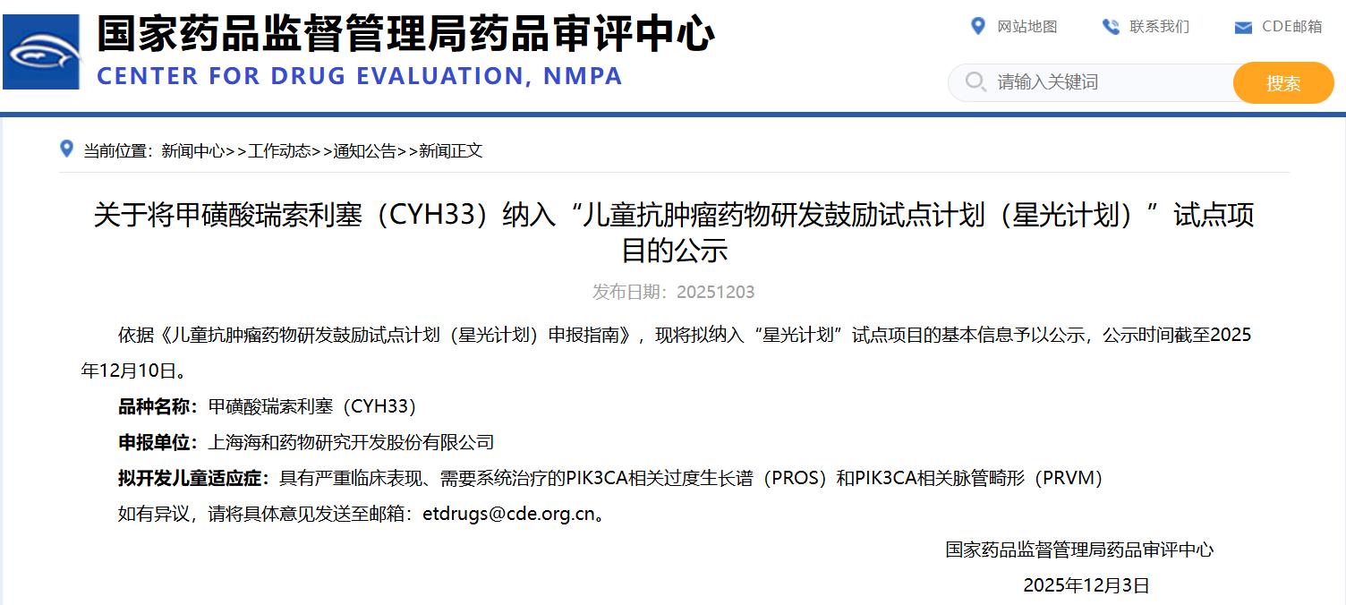關(guān)于將甲磺酸瑞索利塞(CYH33)納入“兒童抗腫瘤藥物研發(fā)鼓勵試點計劃(星光計劃)”試點項目的公示