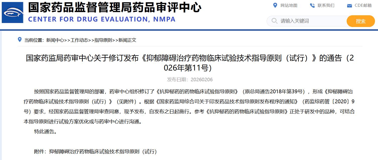 國(guó)家藥監(jiān)局藥審中心關(guān)于修訂發(fā)布《抑郁障礙治療藥物臨床試驗(yàn)技術(shù)指導(dǎo)原則(試行)》的通告(2026年第11號(hào))