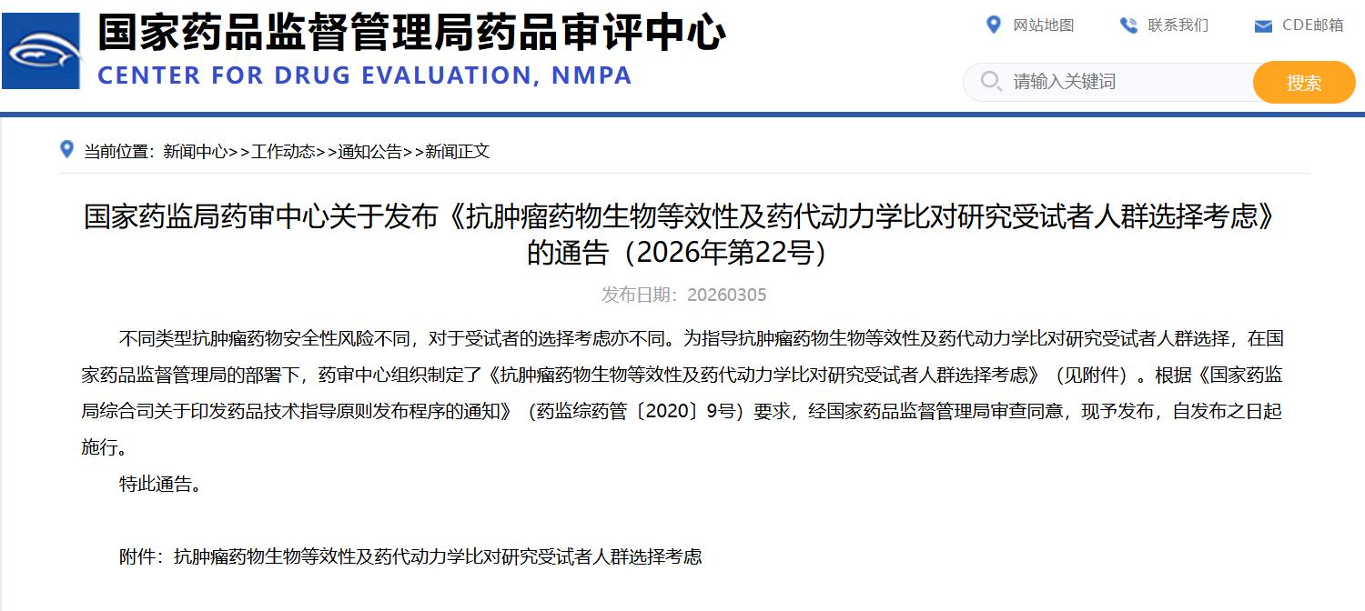 國家藥監(jiān)局藥審中心關(guān)于發(fā)布《抗腫瘤藥物生物等效性及藥代動(dòng)力學(xué)比對(duì)研究受試者人群選擇考慮》的通告(2026年第22號(hào))