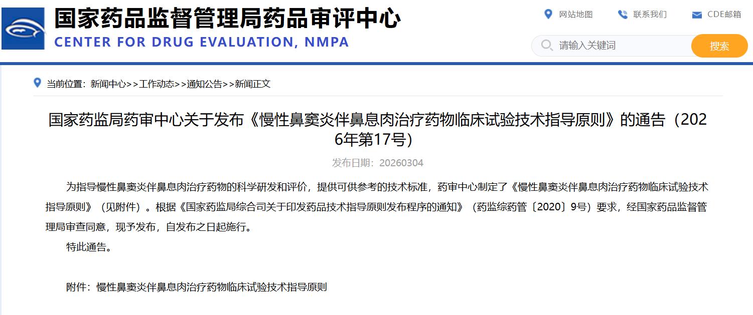 國家藥監(jiān)局藥審中心關(guān)于發(fā)布《慢性鼻竇炎伴鼻息肉治療藥物臨床試驗(yàn)技術(shù)指導(dǎo)原則》的通告(2026年第17號(hào))