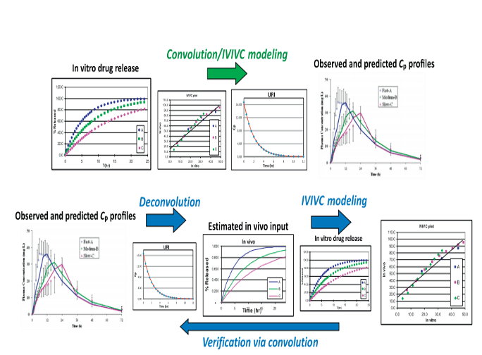 PK模型構(gòu)建:可通過人體IV數(shù)據(jù),利用反卷積方法計算PK數(shù)據(jù);或通過具有快速溶出的口服制劑,獲得處置模型;如無人體數(shù)據(jù),可利用體外數(shù)據(jù)進行預測,或采用動物數(shù)據(jù),進行推算。