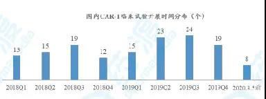 我們對Clinicaltrials.gov數(shù)據(jù)庫導(dǎo)出的148個CAR-T臨床試驗進(jìn)行了整理分析,2018年至今正式開展的臨床試驗個數(shù)時間分布見下圖。