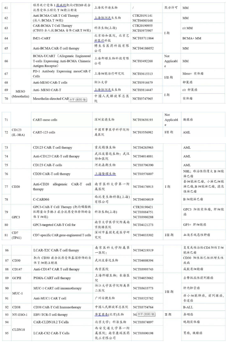 由上表可知,在開發(fā)靶點中,研究最多的是治療血液瘤的靶向CD19的品種,其次是治療實體瘤的靶向BCMA和Mesothelin的品種。
