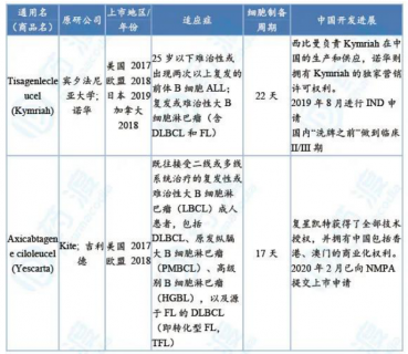 目前,全球共有兩款CAR-T細(xì)胞治療產(chǎn)品上市,其具體獲批情況見下表。
