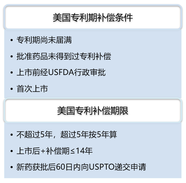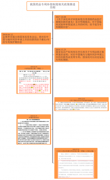 2017年10月《關(guān)于深化審評(píng)審批制度改革鼓勵(lì)藥品醫(yī)藥器械創(chuàng)新的意見(jiàn)》中首次明確提出對(duì)于因臨床試驗(yàn)和審批延誤上市時(shí)間的藥品專(zhuān)利給予適當(dāng)?shù)膶?zhuān)利期限補(bǔ)償。2019年1月公開(kāi)的《專(zhuān)利法修正案(草案)》中提出對(duì)于在中國(guó)境內(nèi)和境外同步申請(qǐng)上市的創(chuàng)新藥品發(fā)明專(zhuān)利,國(guó)務(wù)院可以給予專(zhuān)利期限延長(zhǎng)。2020年7月公開(kāi)的《專(zhuān)利法修正案(草案二次審議稿)》中則修改為對(duì)在中國(guó)獲批上市許可的新藥發(fā)明專(zhuān)利適當(dāng)給予專(zhuān)利期限補(bǔ)償。