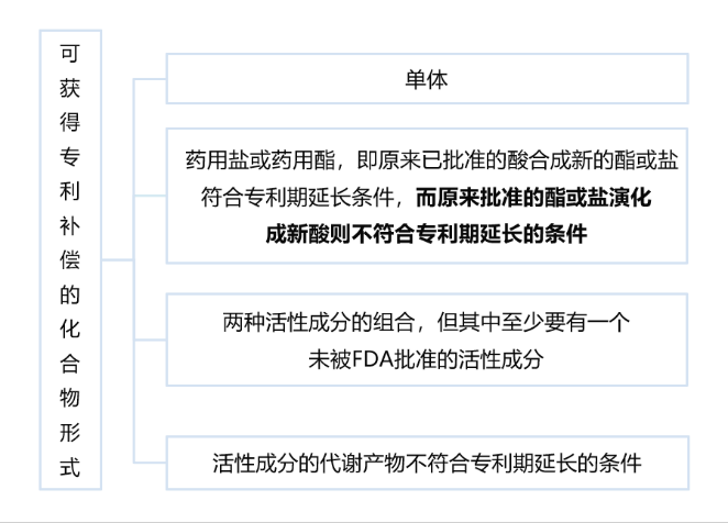 - (2)FDA對(duì)于可獲得專(zhuān)利期延長(zhǎng)的藥品專(zhuān)利中的活性成分有特殊限定,如下所示: