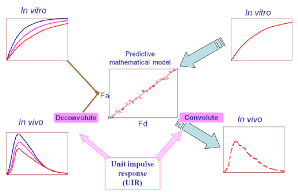 體內(nèi)外相關(guān)性模型,用IVIVR(in-vivo and in-vivo relationship)來表示,即將藥品的體外特性(主要為溶出曲線)和體內(nèi)特性(藥動(dòng)學(xué))建立相關(guān)性。根據(jù)體外溶出數(shù)據(jù),預(yù)測(cè)藥物的在體內(nèi)的藥動(dòng)學(xué)曲線,該方法為卷積法。相反,利用藥物的吸收曲線,可預(yù)測(cè)藥物在體內(nèi)的溶出,該方法為反卷積法,如下圖所示: