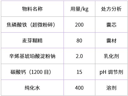 由于焦磷酸鐵在食品營(yíng)養(yǎng)強(qiáng)化中用途廣用量大,結(jié)合工業(yè)化方便、經(jīng)濟(jì)的生產(chǎn)實(shí)際特點(diǎn),本人在生產(chǎn)實(shí)踐中采用噴霧干燥法,以糖類物質(zhì)為壁材,采用微膠囊化技術(shù)對(duì)普通焦磷酸鐵原料進(jìn)行包埋處理,處理后的焦磷酸鐵性狀呈現(xiàn)小顆粒狀細(xì)粉,流散性好,加工性能(混合均勻性)得以提高,同時(shí)焦磷酸鐵經(jīng)過微膠囊化包埋處理,避免了與植物蛋白直接接觸誘發(fā)酸敗。