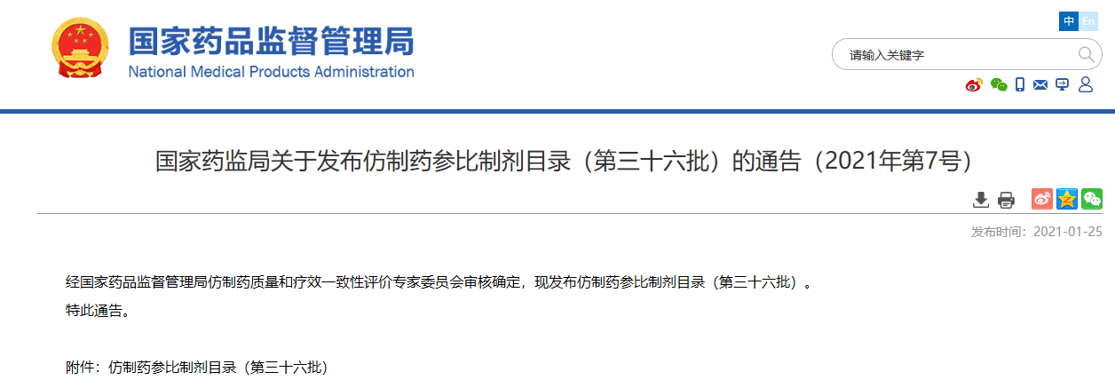關(guān)于發(fā)布仿制藥參比制劑目錄(第三十六批)的通告(2021年第7號(hào))