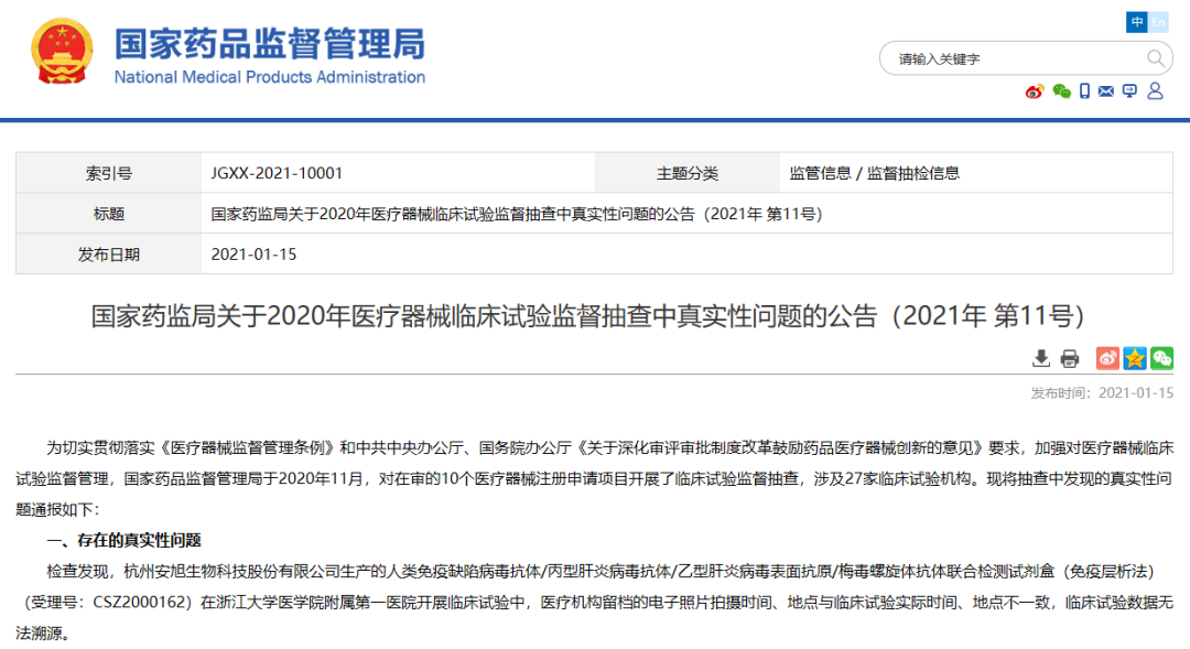 關(guān)于2020年醫(yī)療器械臨床試驗(yàn)監(jiān)督抽查中真實(shí)性問題的公告(2021年 第11號(hào))