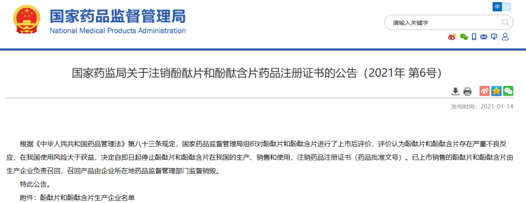 關(guān)于注銷酚酞片和酚酞含片藥品注冊(cè)證書的公告(2021年第6號(hào))