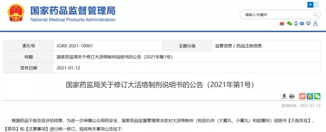關(guān)于修訂大活絡(luò)制劑說明書的公告(2021年第1號(hào))