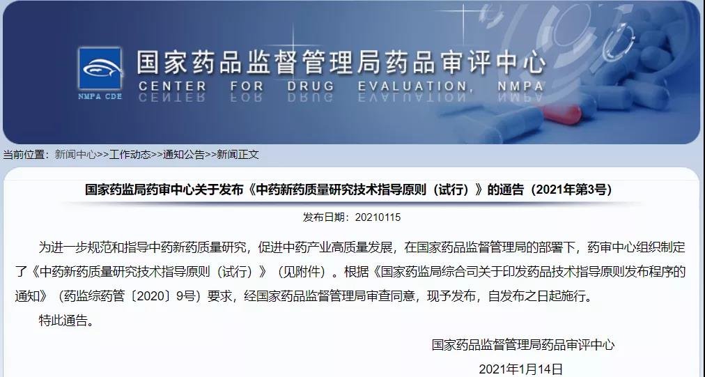 關(guān)于發(fā)布《中藥新藥質(zhì)量研究技術(shù)指導(dǎo)原則(試行)》的通告(2021年第3號(hào))