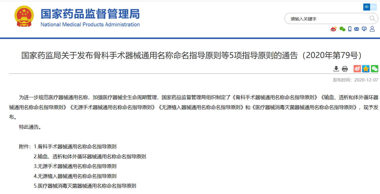 為進一步規(guī)范醫(yī)療器械通用名稱,加強醫(yī)療器械全生命周期管理,國家藥品監(jiān)督管理局組織制定并發(fā)布《骨科手術(shù)器械通用名稱命名指導(dǎo)原則》《輸血、透析和體外循環(huán)器械通用名稱命名指導(dǎo)原則》《無源手術(shù)器械通用名稱命名指導(dǎo)原則》《無源植入器械通用名稱命名指導(dǎo)原則》和《醫(yī)療器械消毒滅菌器械通用名稱命名指導(dǎo)原則》。