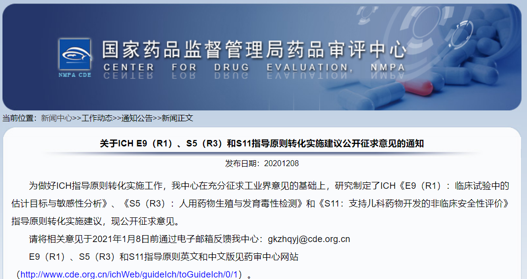 臨床試驗中的估計目標(biāo)與敏感性分析》、《S5(R3):人用藥物生殖與發(fā)育毒性檢測》和《S11:支持兒科藥物開發(fā)的非臨床安全性評價》指導(dǎo)原則轉(zhuǎn)化實施建議,現(xiàn)公開征求意見至2021年1月8日。