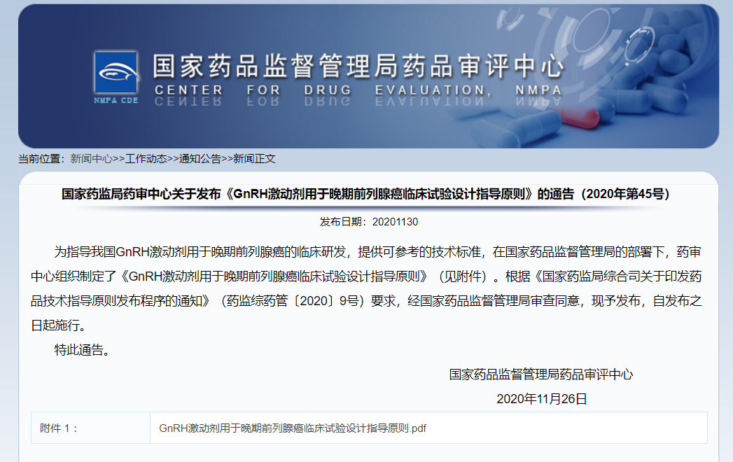 關(guān)于發(fā)布《GnRH激動劑用于晚期前列腺癌臨床試驗(yàn)設(shè)計(jì)指導(dǎo)原則》的通告(2020年第45號)
