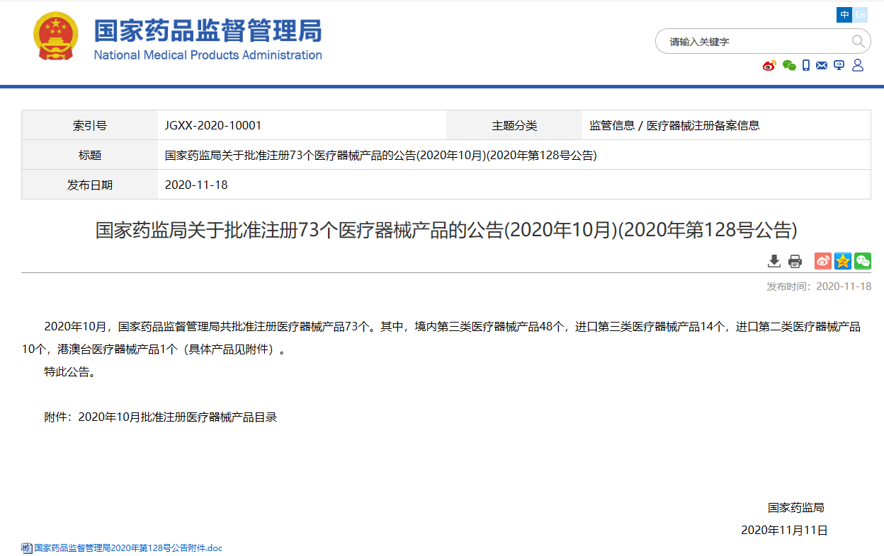 國(guó)家藥監(jiān)局關(guān)于批準(zhǔn)注冊(cè)73個(gè)醫(yī)療器械產(chǎn)品的公告(2020年10月)(2020年第128號(hào)公告)