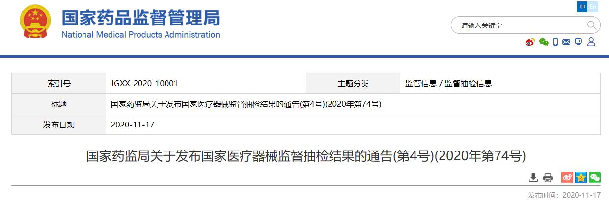國(guó)家藥監(jiān)局關(guān)于發(fā)布國(guó)家醫(yī)療器械監(jiān)督抽檢結(jié)果的通告(第4號(hào))(2020年第74號(hào))
