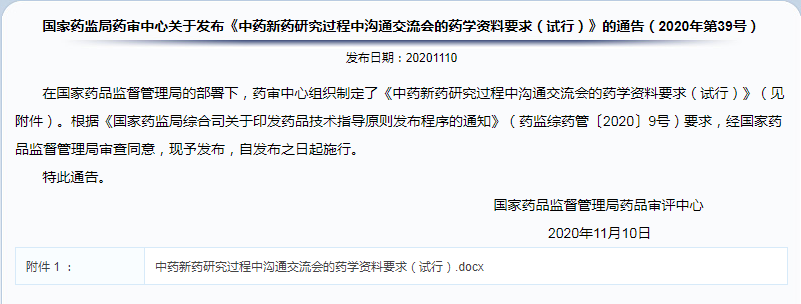 《中藥新藥研究過程中溝通交流會的藥學(xué)資料要求(試行)》的通告(2020年第39號)