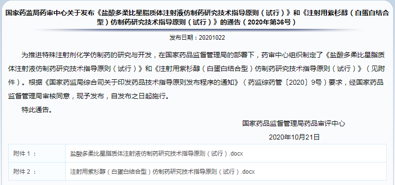 ? 國(guó)家藥監(jiān)局藥審中心關(guān)于發(fā)布《鹽酸多柔比星脂質(zhì)體注射液仿制藥研究技術(shù)指導(dǎo)原則(試行)》和《注射用紫杉醇(白蛋白結(jié)合型)仿制藥研究技術(shù)指導(dǎo)原則(試行)》的通告(2020年第36號(hào))