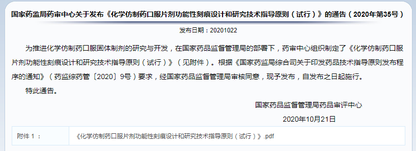 ? 國(guó)家藥監(jiān)局藥審中心關(guān)于發(fā)布《化學(xué)仿制藥口服片劑功能性刻痕設(shè)計(jì)和研究技術(shù)指導(dǎo)原則(試行)》的通告(2020年第35號(hào))