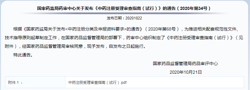 ? 國(guó)家藥監(jiān)局藥審中心關(guān)于發(fā)布《中藥注冊(cè)受理審查指南(試行)》的通告(2020年第34號(hào))