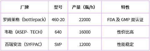 國(guó)內(nèi)生產(chǎn)BFS線的制造商主要有楚天科技、上海東富龍、上海位山等。主要型號(hào)及生產(chǎn)能力如下表所示(以2~5ml灌裝量為例):
